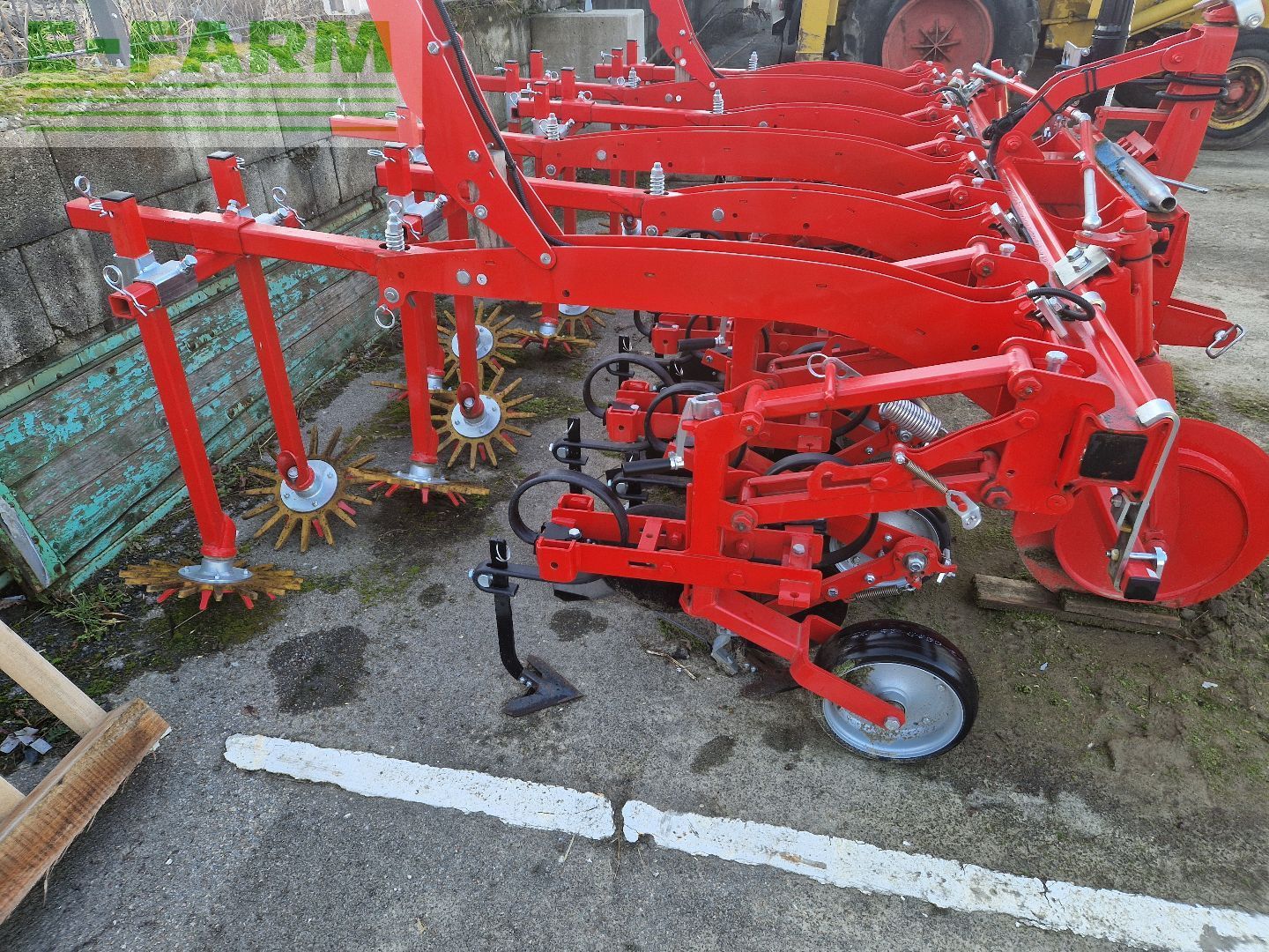 | Free text | Frontanbau, mit Pflanzenschutzbleche, 7 Parallelogramme einzugsverstärkt und nachstellbar = 5 Hackkörper mit je 3 Stück Vibrozinken, 2 Hackkörper mit je 2 Vibrozinken, Zinken gut höhen und seitenverstellbar, spindelverstellbare Farmflex Tasträder, kugelgelagert, 300/100m breit, breites Rahmenprofil 3,2m, für Reihenabstand 50cm = 3,2m Transportbreite, Anbaukategorie II, Zwischenbock in langer Ausführung, Fingerhacke komplett für erste Reihe, zusätzlich 2 stk. Stützräder für Fingerhackausführung Standort: LGH Sierndorf |