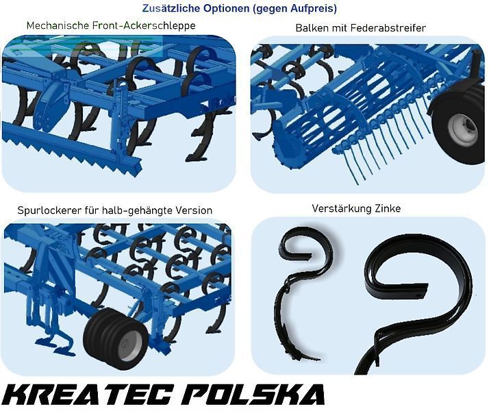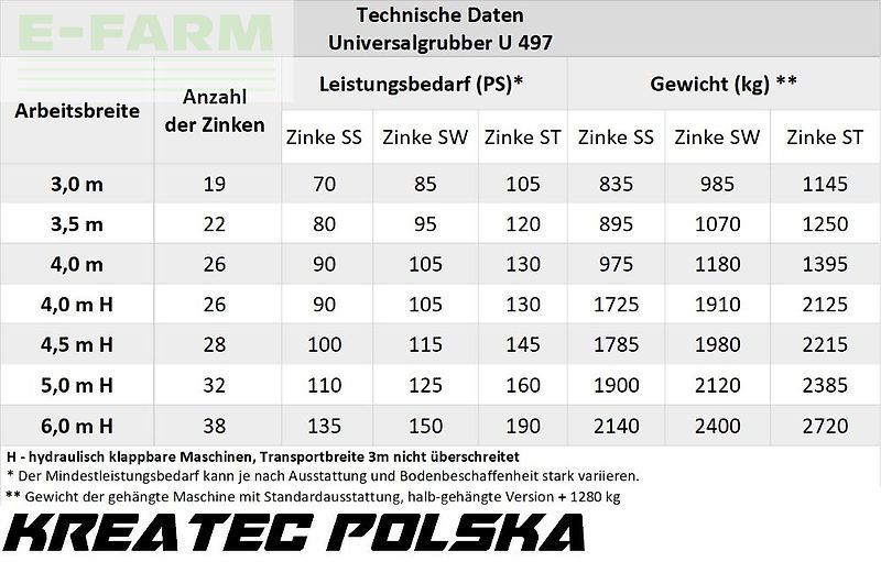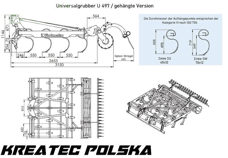 | Modell | Grubber universal / Universalgrubber U 497 gehängte Version für Saatbettbereitung und Stoppelbearbeitung mit Zinken SW (Feder 70x12 mm) von 3 m bis 6 m |